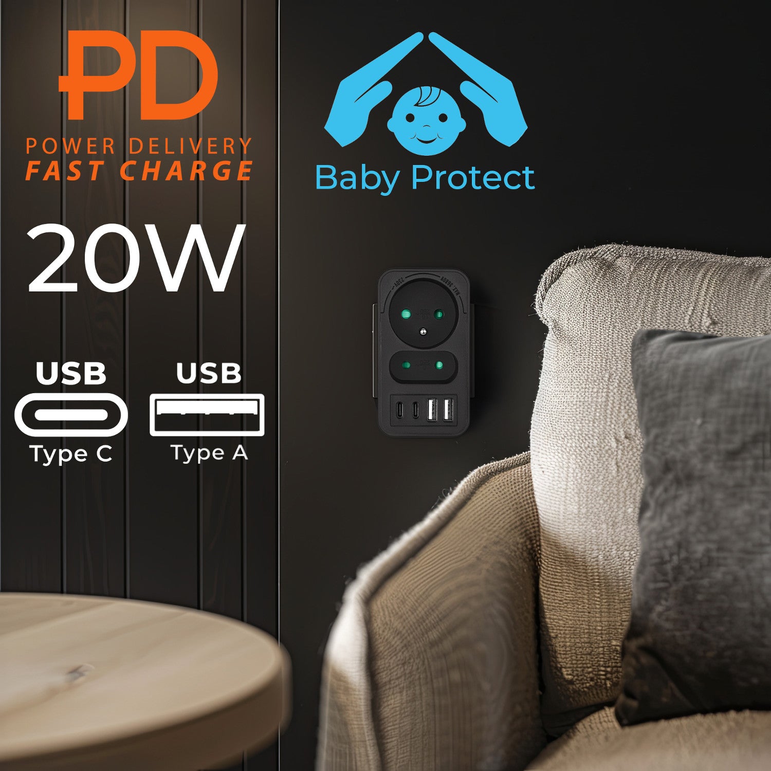 Dva integrované porty USB typu A s proudem až 3A (max. 18 W) jsou ideální pro nabíjení příslušenství, jako jsou bezdrátová sluchátka, powerbanky, reproduktory Bluetooth nebo sportovní náramky. A dva porty USB typu C s technologií Power Delivery (max. 20 W) zajišťují rychlé a stabilní nabíjení moderních zařízení - smartphonů, tabletů, přenosných konzolí a dalších zařízení, která podporují standard Power Delivery. Díky této kombinaci lze současně napájet více zařízení s různými požadavky na napájení, aniž by bylo nutné používat další nabíječky.