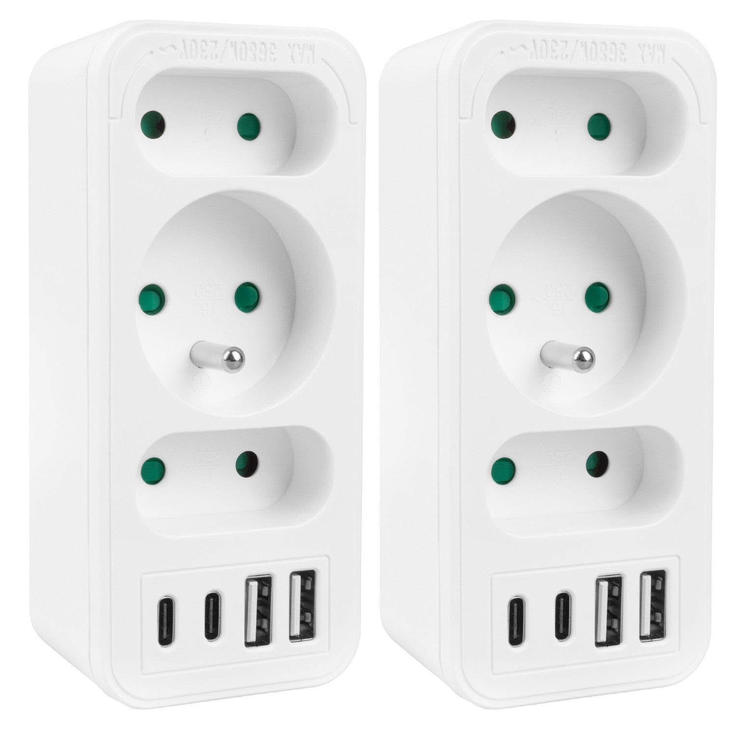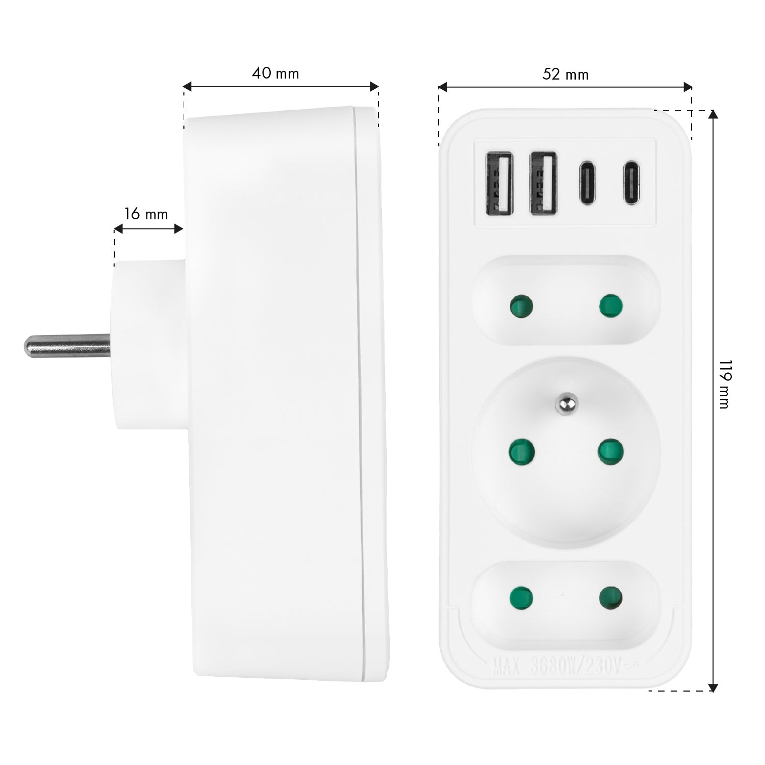 2x rozbočovač 3 zásuvky 2x USB-A 2x USB-C bílá
