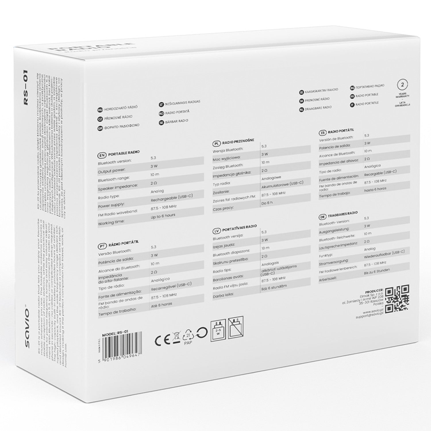 Přenosné FM rádio Savio, bateriové napájení, Bluetooth, AUX, SAVRS-01