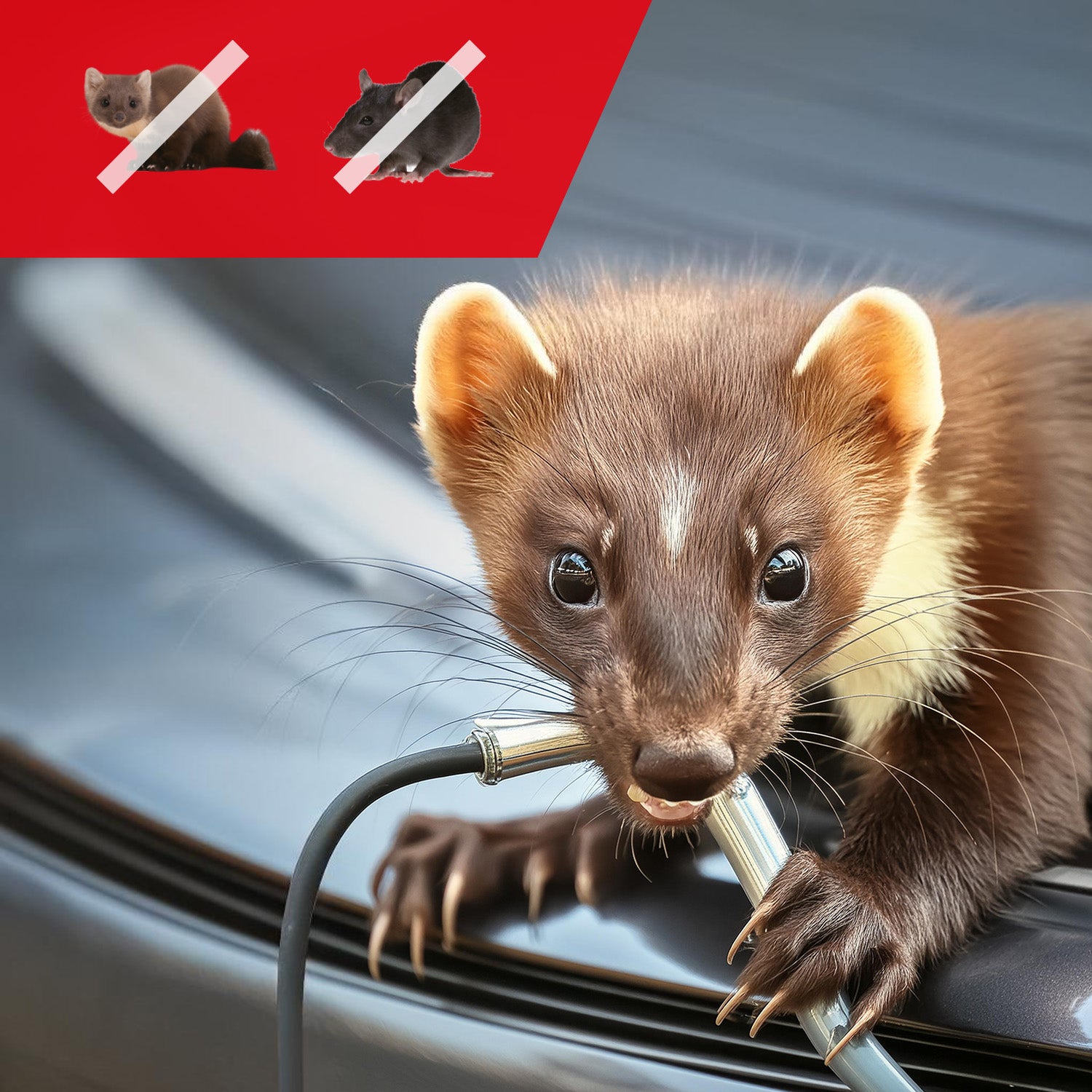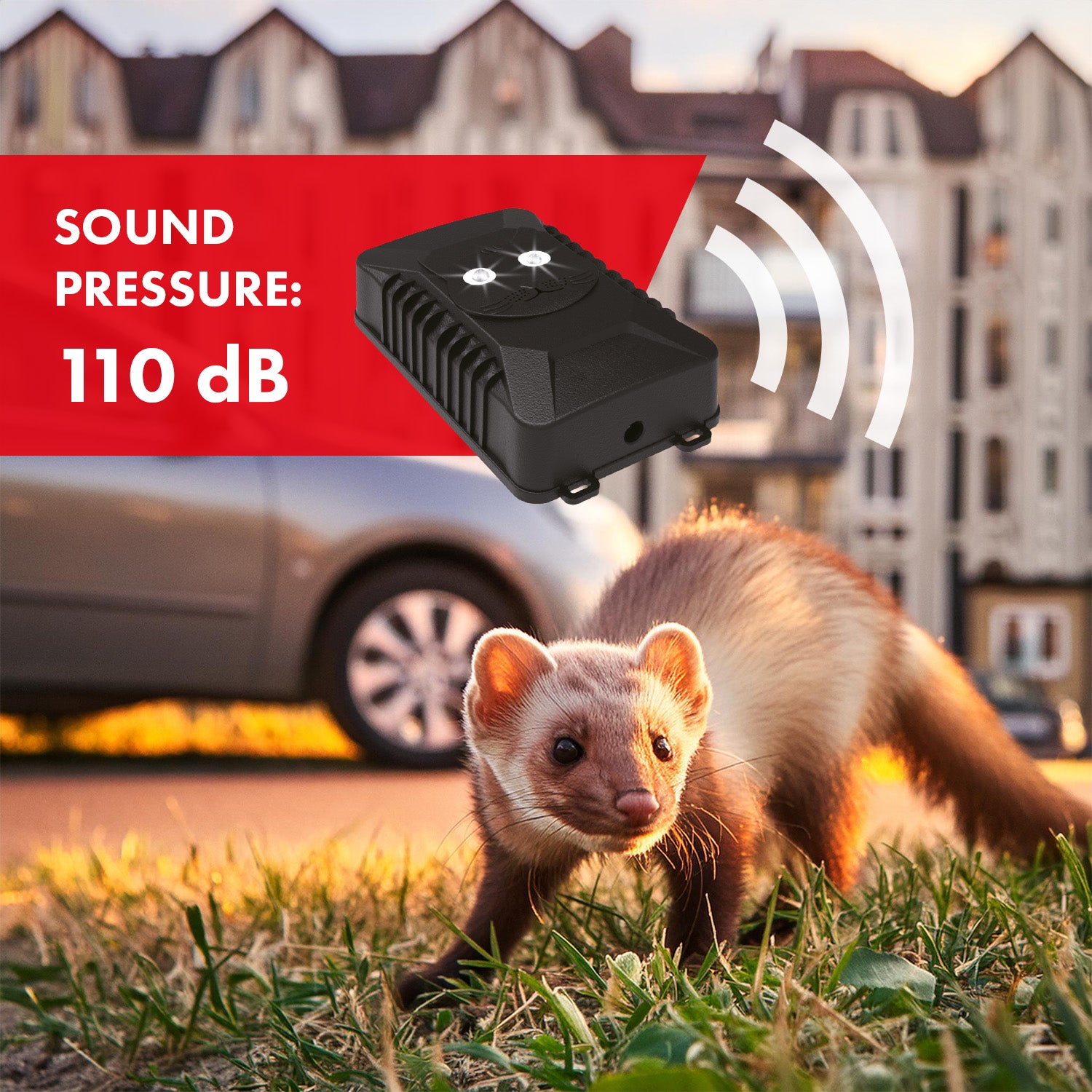 Ultrazvuk s proměnlivou frekvencí 18-36 kHz je neškodný pro psy, kočky a další domácí zvířata a zároveň účinně odpuzuje hlodavce a kuny. Odpuzovač lze napájet přímo z autobaterie, z akumulátoru a díky přiloženému kabelu USB lze zařízení napájet i ze sítě.