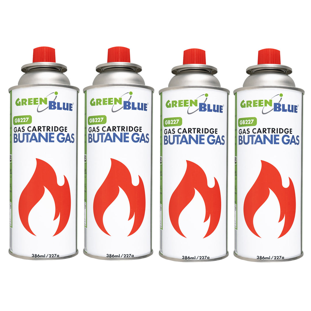 4 plynové kartuše GreenBlue 227 g. Certifikát: Pi 0875, v souladu s normou EN 417, butan, provozní teplota -10 °C až +40 °C, GB227