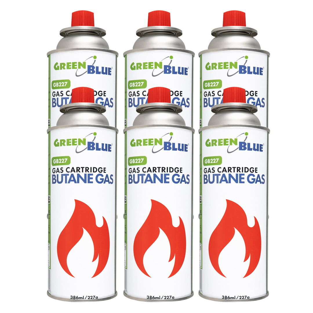 6x plynová náplň 227 g GreenBlue. Certifikát: Pi 0875, v souladu s normou EN 417, butan, provozní teplota -10 °C až +40 °C, GB227