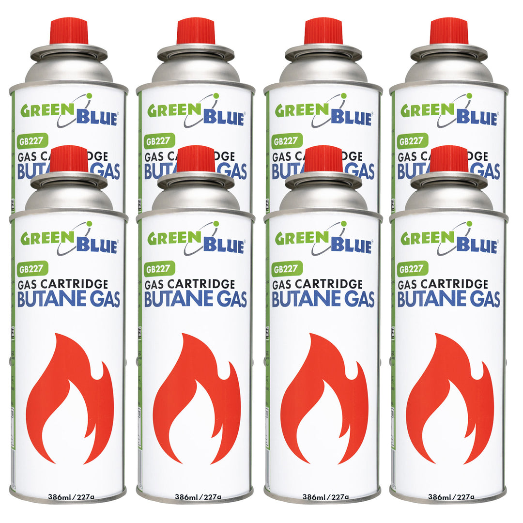 8x plynová náplň 227 g GreenBlue. Certifikát: Pi 0875, v souladu s normou EN 417, butan, provozní teplota -10 °C až +40 °C, GB227