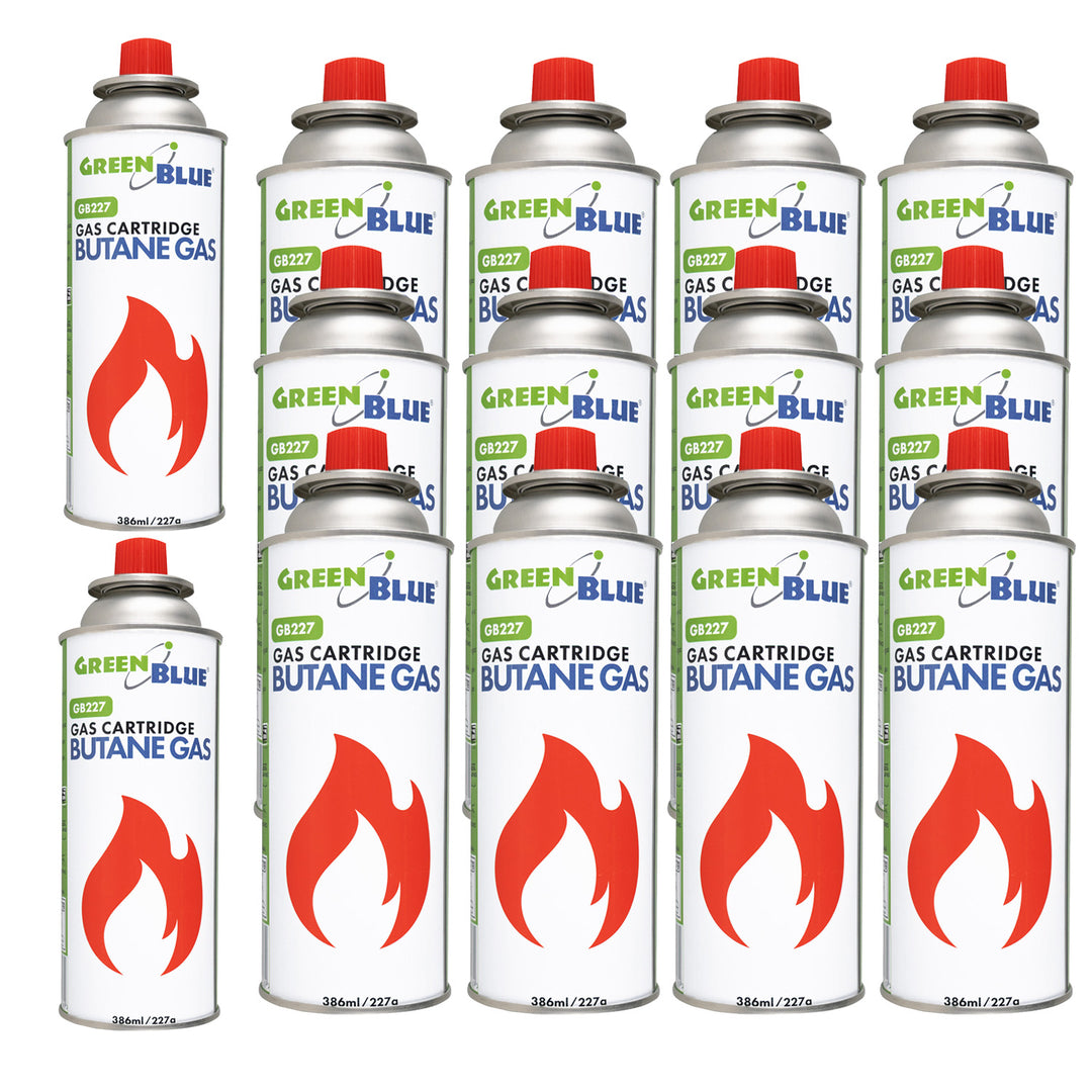 12 plynových náplní GreenBlue 227 g. Certifikát: Pi 0875, v souladu s normou EN 417, butan, provozní teplota -10 °C až +40 °C, GB227