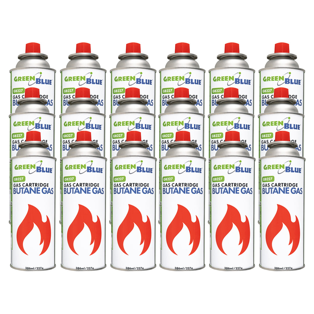 18 plynových náplní GreenBlue 227 g. Certifikát: Pi 0875, v souladu s normou EN 417, butan, provozní teplota -10 °C až +40 °C, GB227