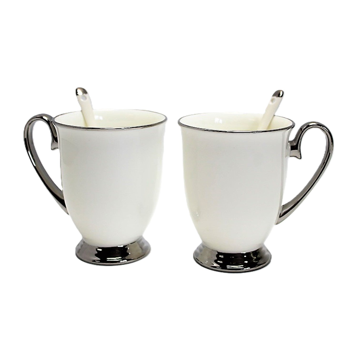Bílé hrnky 2ks Chromované rukojeti, lžičky, porcelán, Elegant, Queen Isabel