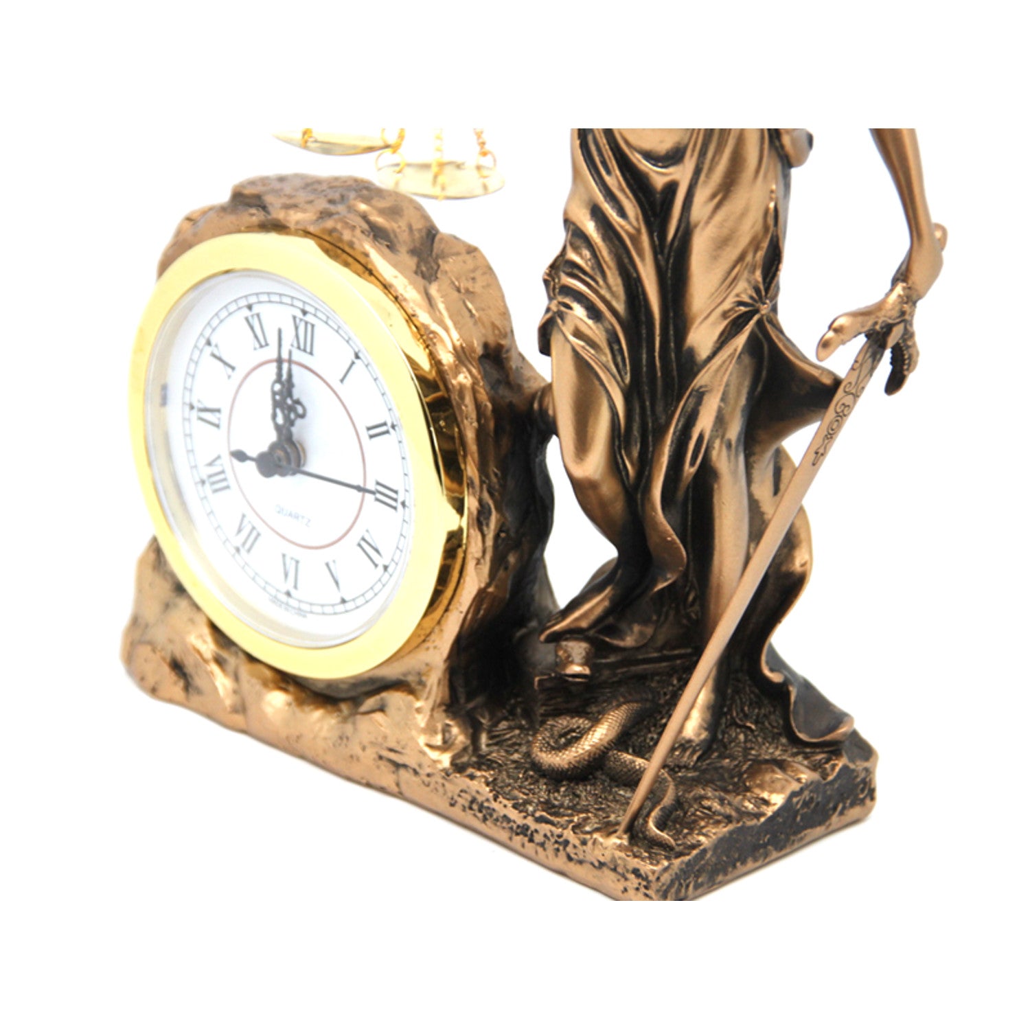 Figurka bohyně spravedlnosti Temidy, hodiny, královna Isabel