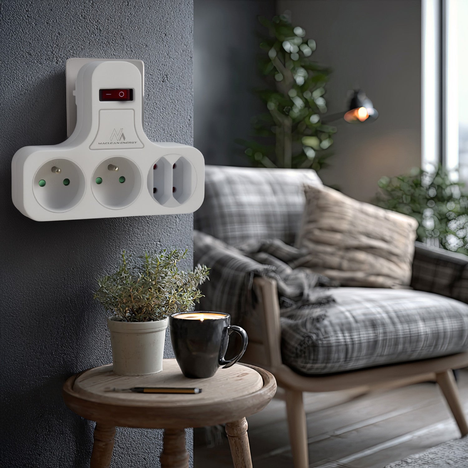 Čtyřnásobná zásuvka s vypínačem a stabilizační patkou Maclean Energy MCE224.