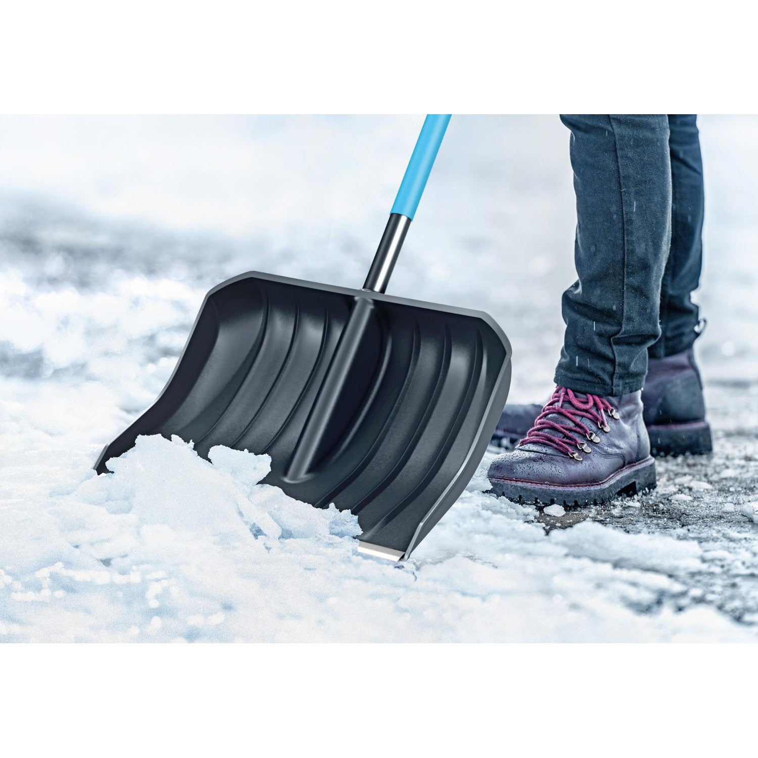 - Hlava s hloubkou 150 mm umožňuje odvoz velkého množství sněhu, a její hrana zakončená hliníkovým proužkem zvyšuje odolnost lopaty proti poškození způsobenému nárazem na kameny nebo tvrdé hroudy sněhu a ledu